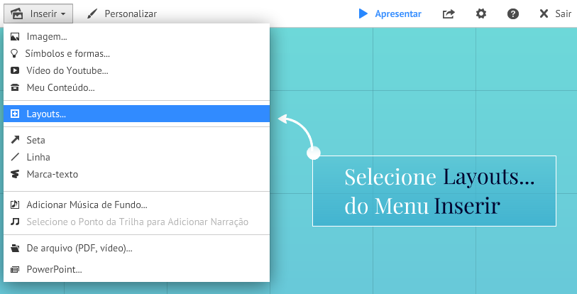 Alternativamente você poderá adicionar molduras do menu superior na forma de layouts para ajudar a organizar suas informações. Clique Inserir no menu superior e selecione Layouts... |