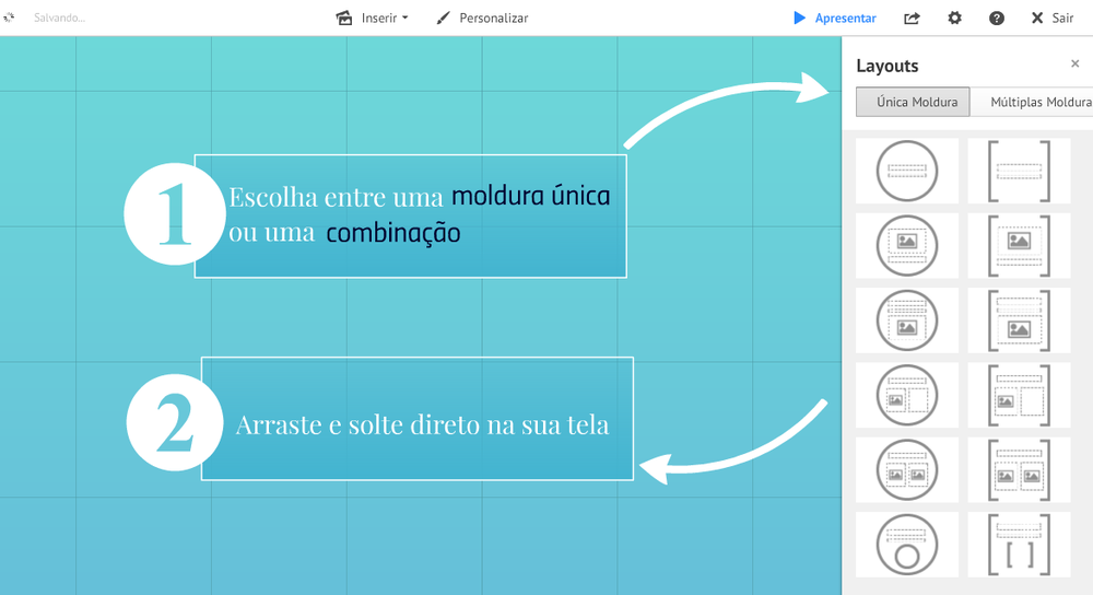 Uma barra lateral irá aparecer permitindo que escolha um layout de moldura único ou uma combinação. Clique na miniatura de sua escolha para inserir aquele layout em seu prezi. Para mais informações, confira nosso artigo sobre layouts. |