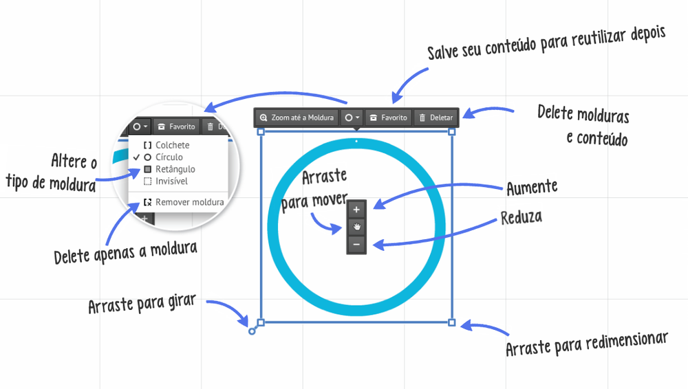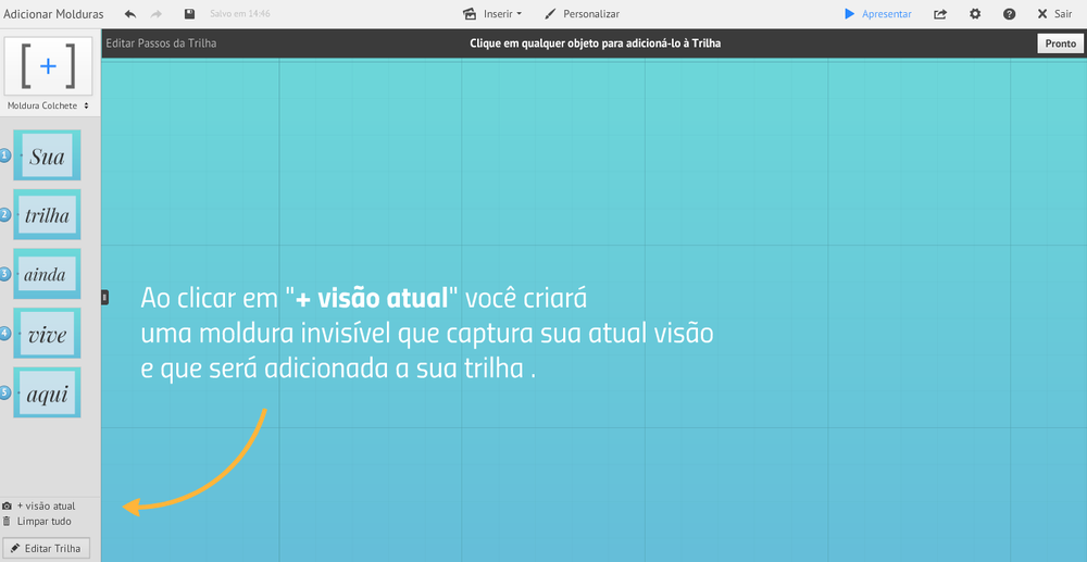 | Usando Molduras Invisíveis Molduras invisíveis organizam o seu conteúdo sem adicionar o visual de um a moldura normal. Elas são ideais para destacar os detalhes em uma imagem grande ou um bloco de texto e são realmente utéis se quiser apresentar o seu prezi sem uma trilha pré-definida. Além de inserir molduras usando a barra lateral à esquerda ou menu layout, uma moldura invisível pode ser adicionada a seus Prezi clicando + visão atual no editar de trilha do seu prezi. Isto irá criar uma moldura invisível com base na visão atual de sua tela, e um ponto em sua trilha também será adicionado. |