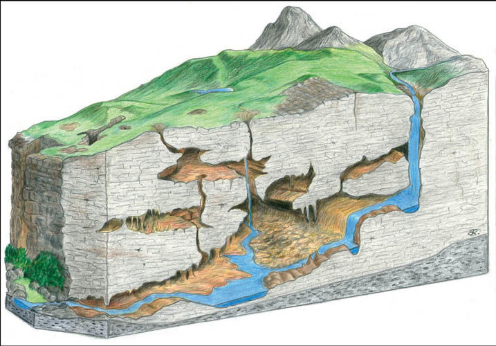 Carsismo - fenomeno di erosione. Durante questo processo le rocce calcaree si sciolgono al contatto con l'acqua piovana formando cavità circolari o a forma di imbuto, grotte, corsi d'acqua sotterranei. |