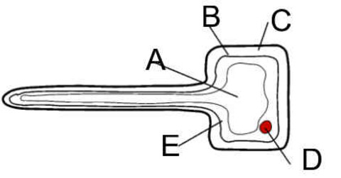 A = Vacuole B = Cell membrane C = Cell wall D = Nucleus E = Cell membrane |