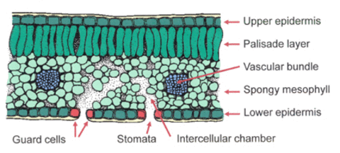 What is the purpose of the lower epidermis? | It is the area which holds the stomata and where gases and water diffuse in and out. |