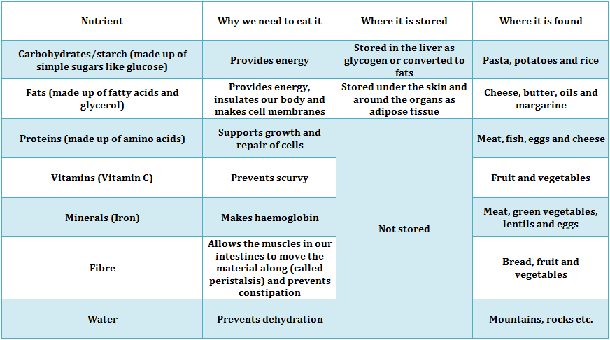 | Why should a balanced diet contain: protein, carbohydrates and fats, minerals (limited to iron), vitamins (limited to vitamin C), fibre & water? |