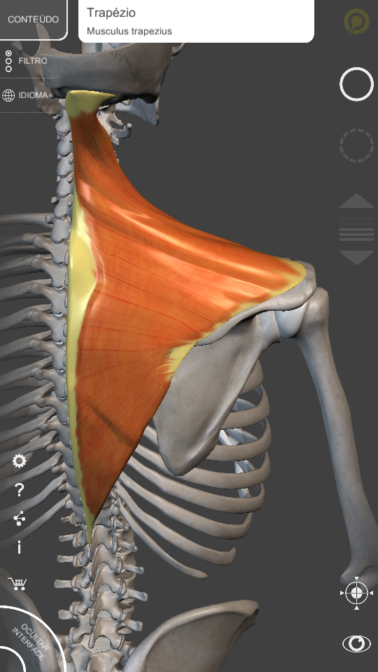 Trapézio Descendente | Origem: Occipital, vértebras cervicais superiores Inserção: Terço lateral da clavícula; acrômio Ação: Elevação, rotação superior da escapula |