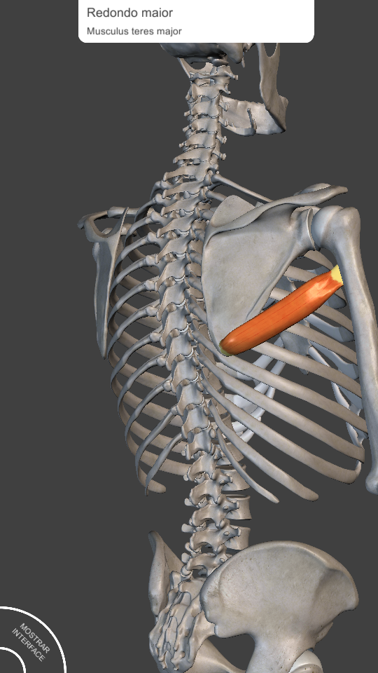 Redondo Maior | Origem: Borda lateral da escapula, próximo ao angulo inferior Inserção: Sulco intertubercular do úmero Ação: extensão, adução e rotação medial do ombro |