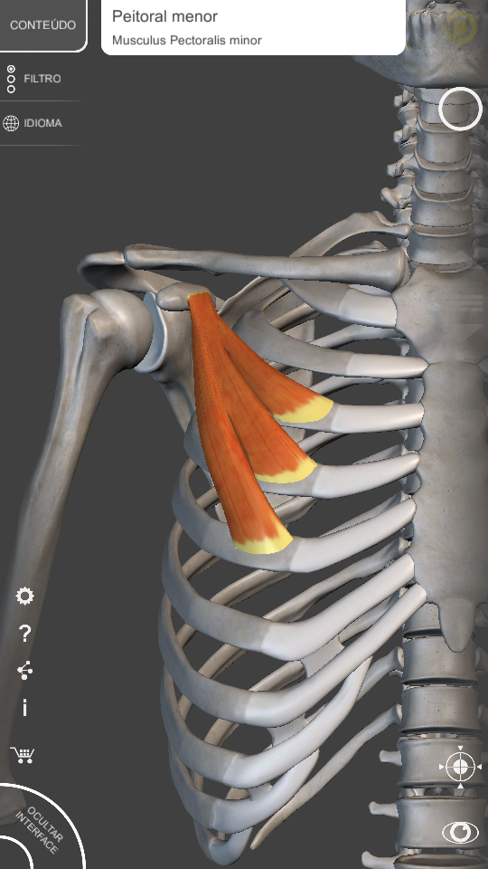 Peitoral Menor | Origem: Terceira a quinta costela Inserção: Processo coracoide da escapula Ação: Depressão, protusão, rotação inferior e inclinação da escapula |