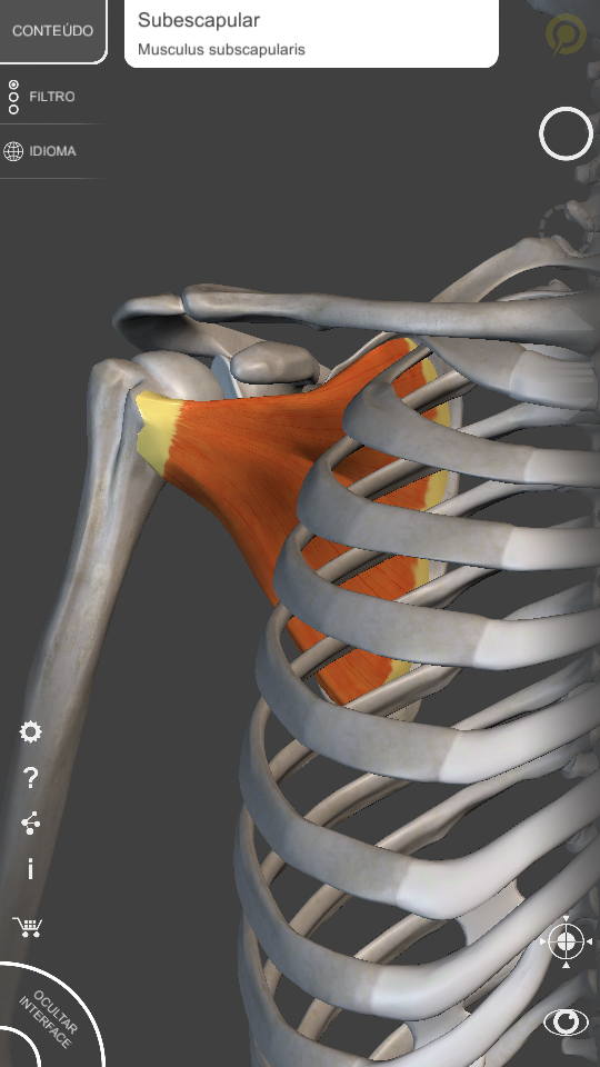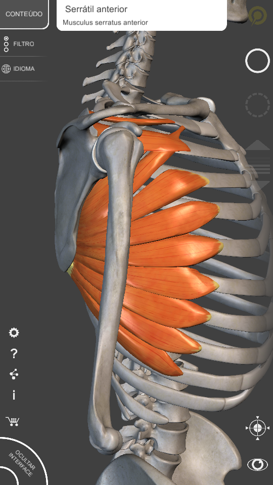 Serrátil Anterior | Origem: Superfície lateral das oito primeiras costelas Inserção: Margem medial da escapula Ação: Protusão, rotação superior da escapula |