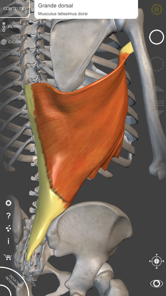 Latíssimo do Dorso | Origem: Processo espinhoso de T7 a L5, face dorsal do sacro, crista ilíaca e três costelas inferiores Inserção: crista do tubérculo menor do úmero (sulco intertubercular) Ação: Adução, extensão e rotação medial do ombro |