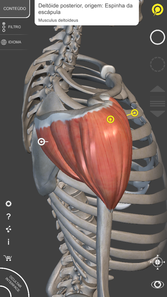 Deltoide Espinal | Origem: espinha da escapula Inserção: tuberosidade deltoidea Ação: extensão de ombro *Abdução e rotação lateral no plano horizontal |