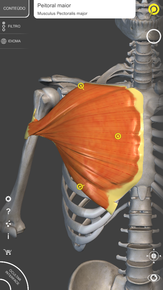 Peitoral Maior | Origem: Terço medial da clavícula, esterno e cartilagem costal das seis primeiras costelas Inserção: Crista do tubérculo maior Ação: Adução do ombro * Parte clavicular faz flexão do ombro até 60° |