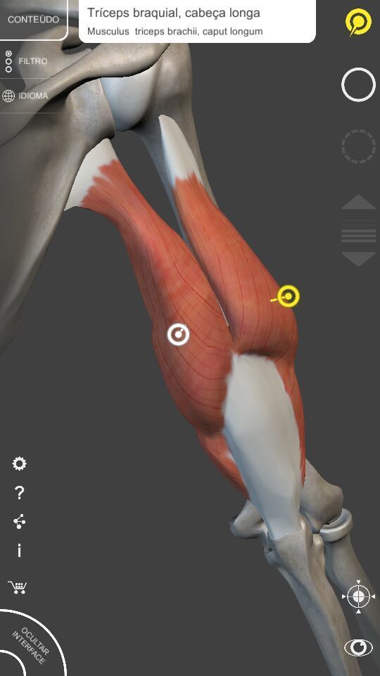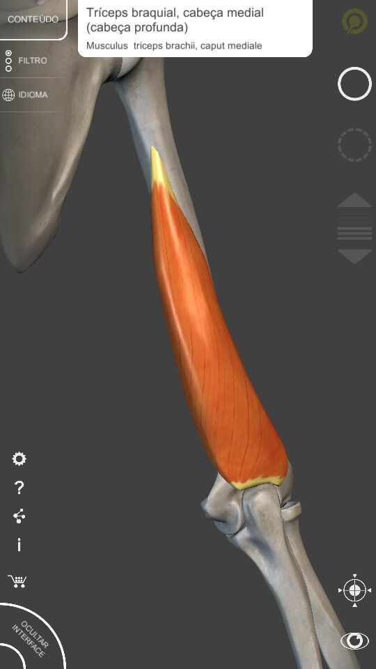 Tríceps cabeça medial | Origem: Face posterior do úmero Inserção: olécrano da ulna Ação: extensão de cotovelo |