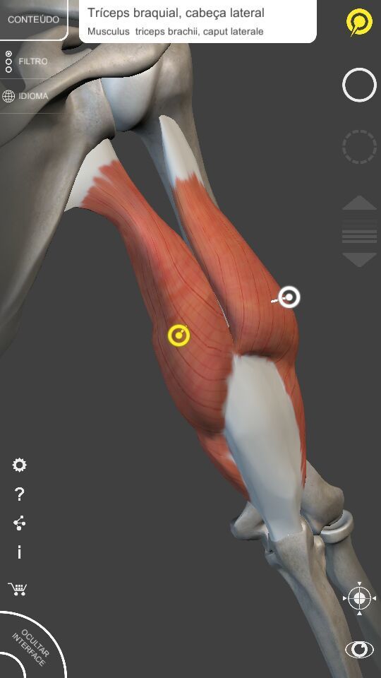Tríceps cabeça lateral | Origem: Face posterior ao úmero (acima do sulco radial) Inserção: Olécrano da ulna Ação: Extensão de cotovelo |
