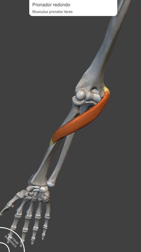 Pronador Redondo | Origem: Epicôndilo medial do úmero e processo coronoide da ulna Inserção: face lateral do radio Ação: Pronação do antebraço * auxilia a flexão de cotovelo |