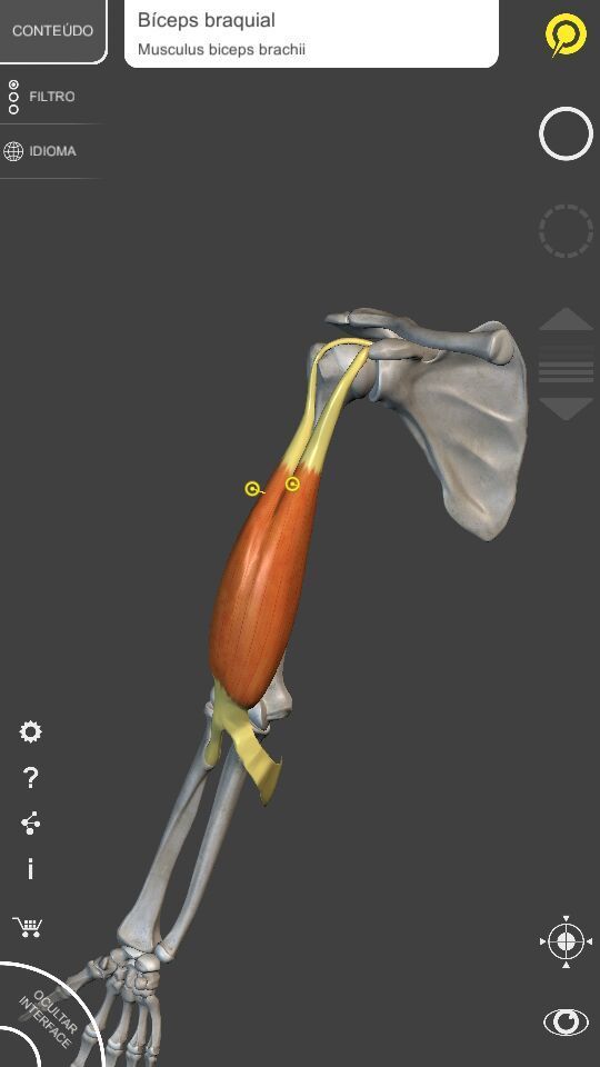 Bíceps Braquial | Origem: Cabeça longa: Tubérculo supraglenoidal cabeça curta: Processo coracoide Inserção: tuberosidade do radio Ação: Flexão de cotovelo e supinação de antebraço |