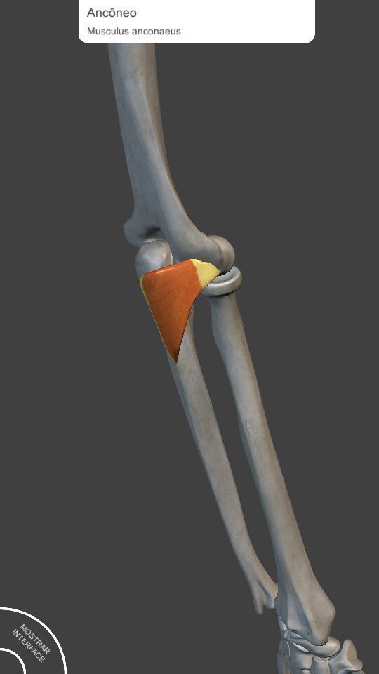 Ancôneo | Origem: Epicôndilo lateral do úmero Inserção: lateral e inferior ao olécrano Ação: auxilia a extensão de cotovelo |