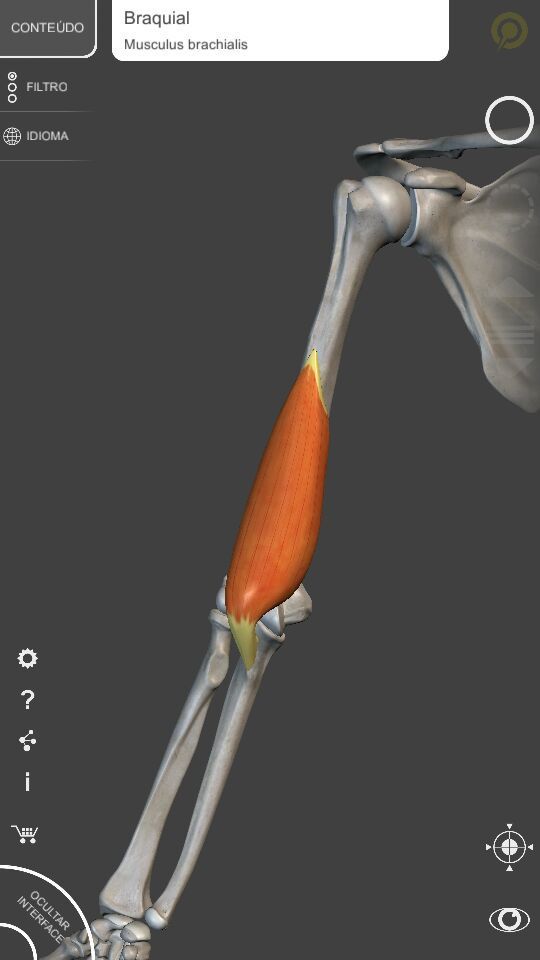 Braquial | Origem: Dois terços distais da face anterior do úmero Inserção: processo coronoide, tuberosidade da ulna Ação: Flexão de cotovelo |