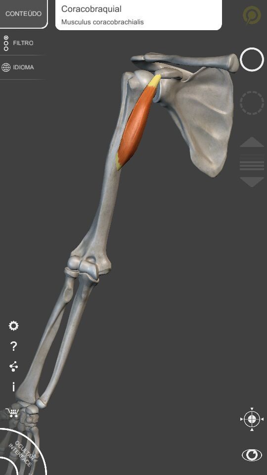 Coracobraquial | Origem: processo coracoide da escapula Inserção: terço médio do úmero Ação: Flexão e adução de ombro |