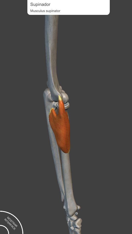 Supinador | Origem: epicôndilo lateral do úmero Inserção: faces da porção proximal do radio Ação: supinação do antebraço |