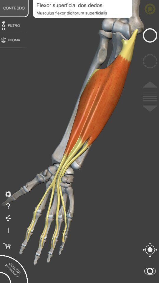 Flexor Superficial dos dedos | Origem: Tendão comum dos Músculos flexores no epicôndilo medial do úmero, processo coronoide da ulna e do radio Inserção: Lado da falange media dos quatro dedos Ação: Flexão das falanges proximais e medias |