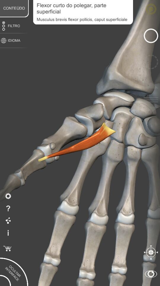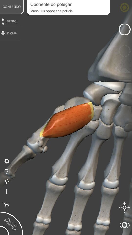 Oponente do polegar | Origem: Osso trapézio e retináculo dos músculos flexores Inserção: primeiro metacarpo Ação: Oposição do polegar |