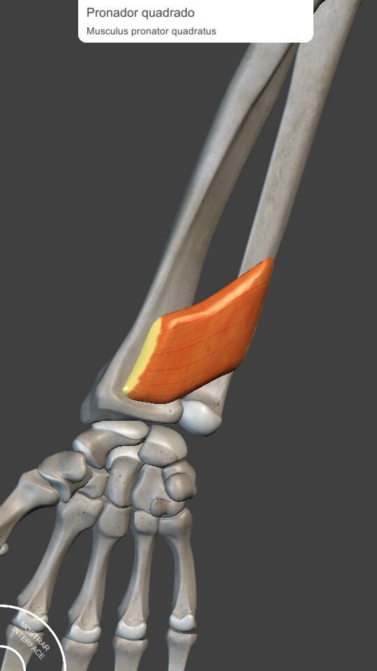 Pronador Quadrado | Origem: quarto distal da ulna Inserção: quarto distal do radio Ação: pronação do antebraço |