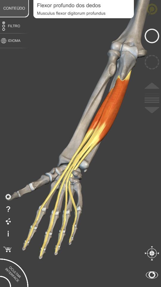 Flexor profundo dos dedos | Origem: três quartos superiores da ulna Inserção: falange distal do II ao V dedo Ação: Flexão das três articulações dos dedos |