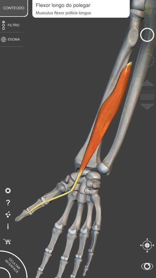 Flexor longo do polegar | Origem: Radio, face anterior Inserção: falange distal do polegar Ação: Flexão das três articulações do polegar |