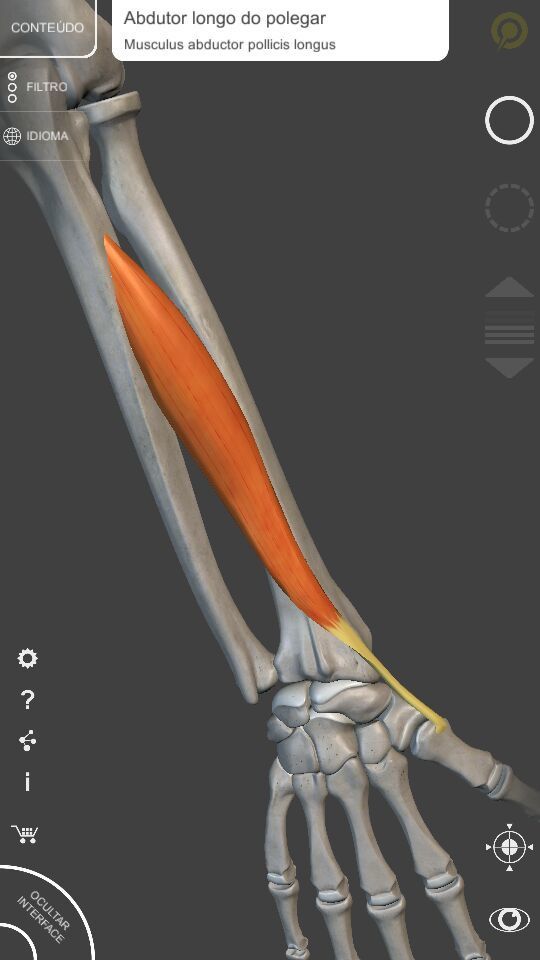 Abdutor do polegar | Origem: região posterior do radio, membrana interóssea e porção media da ulna Inserção: Base do primeiro metacarpo Ação: Abdução do polegar |
