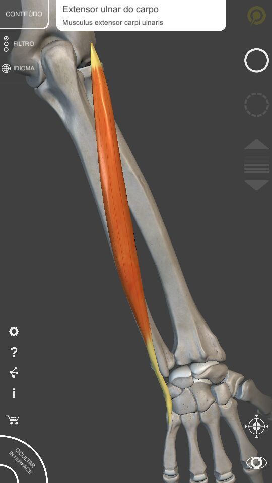 Extensor Ulnar do Carpo | Origem: Epicôndilo lateral do úmero Inserção: Base do V metacarpo Ação: Extensão e adução da mão |