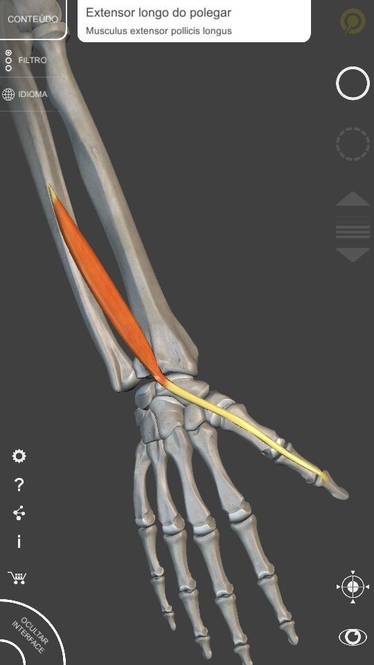 Extensor Longo do polegar | Origem: região posterior do terço médio da ulna e membrana interossea Inserção: Base da falange distal do polegar Ação: Extensão das três articulações do polegar |
