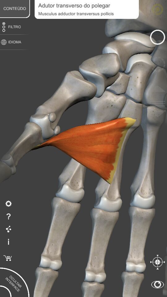 Adutor do polegar | Origem: Osso capitato, base do segundo osso metacarpal e face palmar do III metacarpo Inserção: Base da falange proximal do polegar Ação: Adução do polegar |