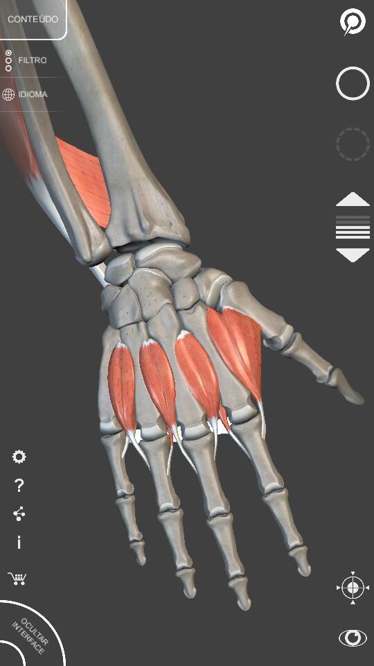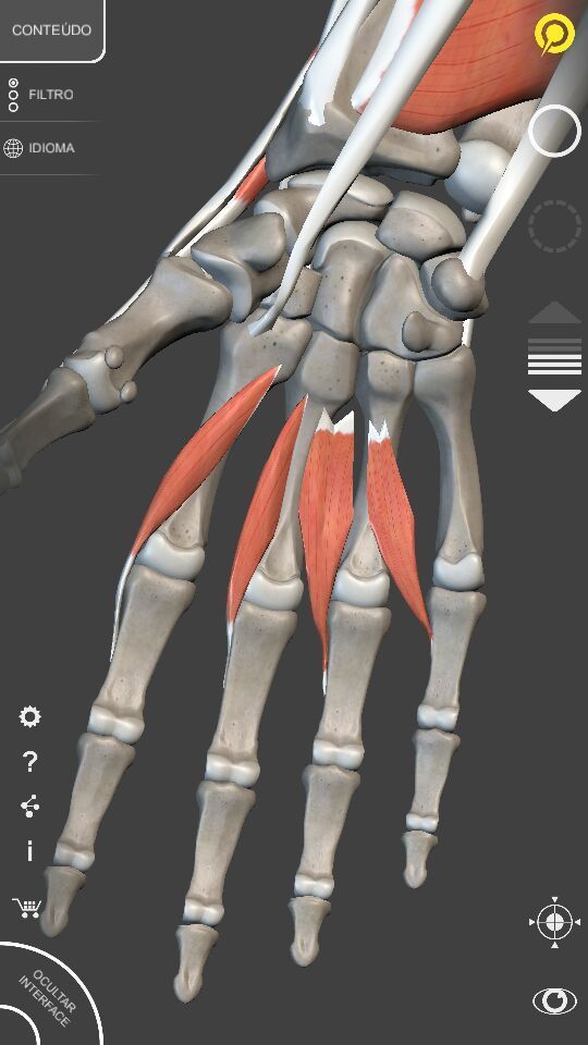 Lumbricais | Origem: Tendão do Músculo flexor profundo dos dedos Inserção: Tendão do músculo extensor dos dedos Ação: Flexão de punho e extensão simultânea das articulações das falanges medias e distais |