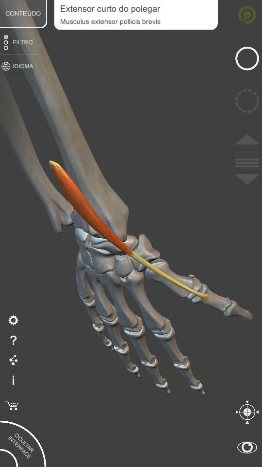 Extensor curto do polegar | Origem: região distal da face posterior do radio e membrana interóssea Inserção: Base da falange proximal do polegar Ação: Extensão da articulação proximal e falange proximal |