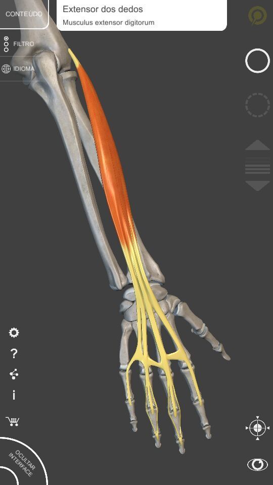 Extensor dos dedos | Origem: Epicôndilo lateral do úmero Inserção: Base da falange distal do II ao V dedo Ação: Extensão das três articulações dos dedos |