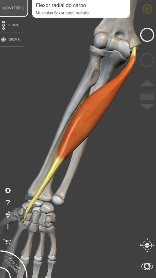 Flexor radial do carpo | Origem: Epicôndilo medial do úmero Inserção: Base do II e III ossos do metacarpo Ação: Flexão e abdução da mão |