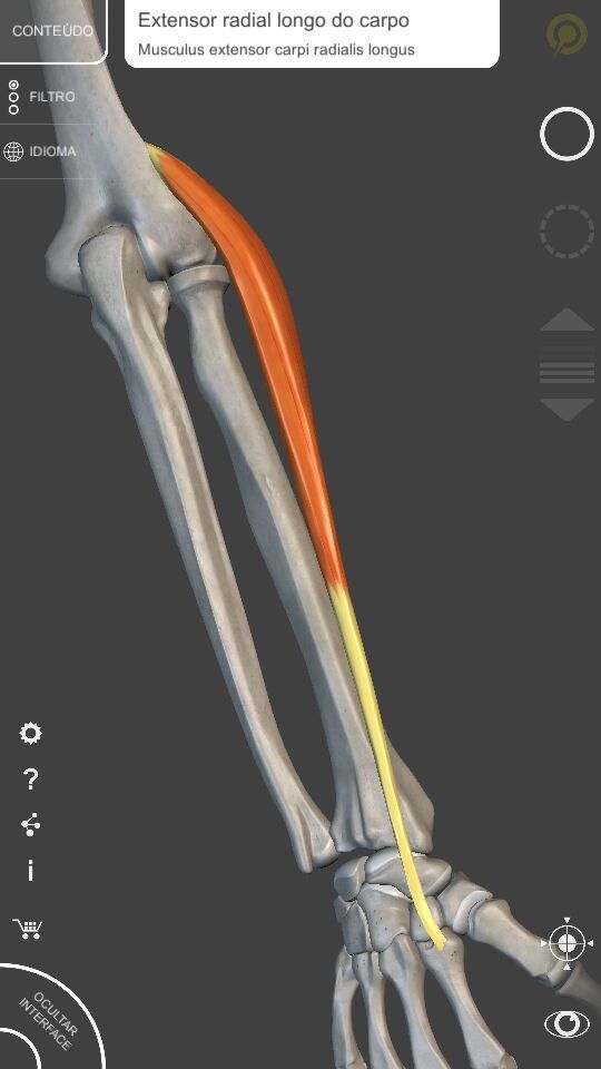 Extensor Radial Longo do Carpo | Origem: Crista supracondilar lateral do úmero Inserção: Base do II osso metacarpal Ação: Extensão e abdução da mão |