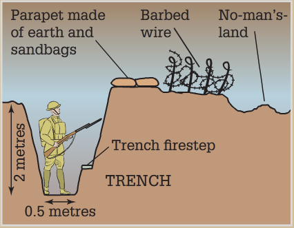 | What were the trenches? | The trenches were long holes in the ground reinforced with timber and sandbags, with wooden floors called duckboards. The aim was to provide some protection from enemy fire. |
