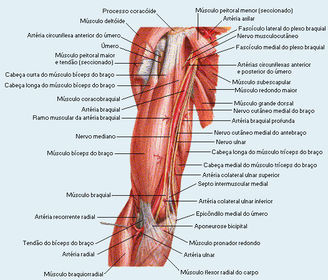 | A Artéria braquial se divide em quais artérias? | Artéria Ulnar e Radial. |