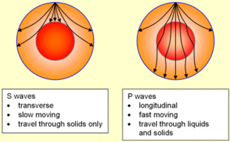 | Using waves to study the Earth | Scientists use waves to study the Earth. P waves can go through all layers of the Earth. S waves can only travel through the crust, mantle and inner core. |