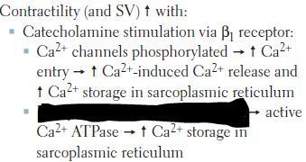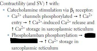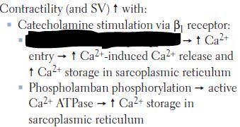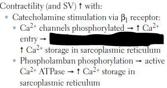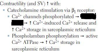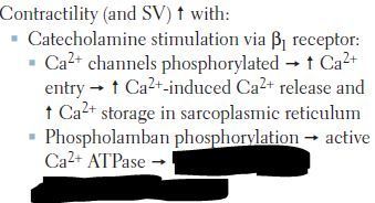 | Contractility (and SV) increase with: Stimulation of what via β1 receptor? | Catecholamine stimulation via β1 receptor |
