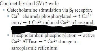 | Contractility (and SV) increase with: Catecholamine stimulation via what receptor? | Catecholamine stimulation via β1 receptor |