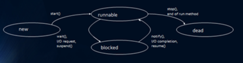 | JAVA: What are the four separate states for Java Threads? (Hint: NRBD) | New - just started but not created Runnable - created, started and able to run Blocked - created started, but unable to run due to waiting for an event Dead - Thread has finished or been stopped |