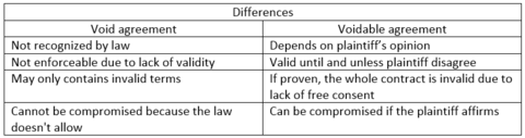 | What is Voidable agreement / contract ? | Agreement which lack voluntariness, consenting mind and free consent. E.g. contract obtained by coercion, fraud, duress, misrepresentation and mistake. |
