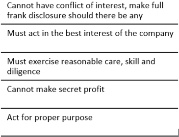 | What are the types of director's duties ? | 1. Fiduciary duty 2. Common law duty 3. Statutory duty |
