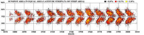 | 1.1h - Interpret data (for example a Butterfly Diagram) in order to describe the long-term latitude drift of sunspots, determine the length of the solar cycle and predict the year of the next solar maximum. |