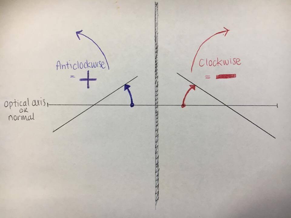 What is the critical angle? | When refracted angle = 90 degrees so, i = sin-1(n'/n) Note: only when n'<n eg. glass to air |