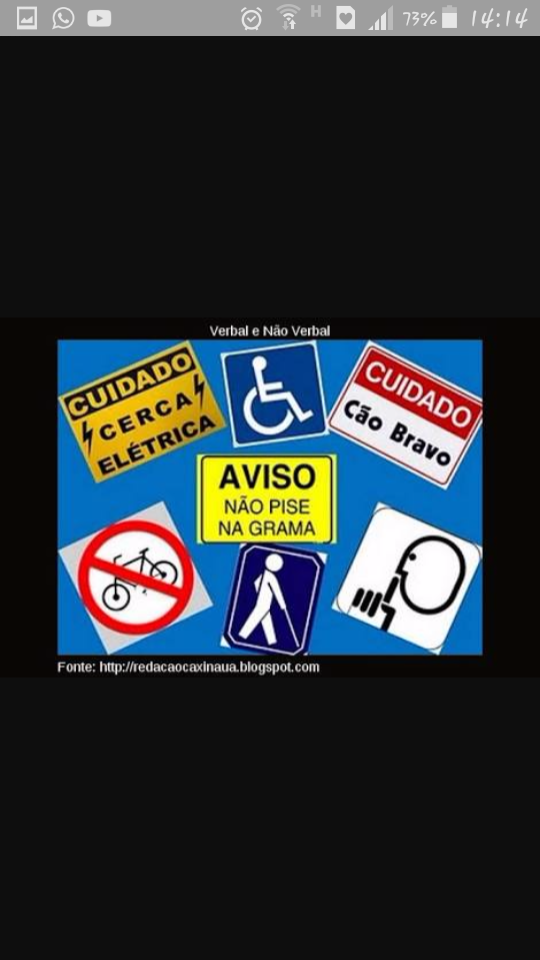 | Quantas imagens com linguagem VERBAL, com linguagem NÃO VERBAL e linguagem HÍBRIDA você encontrou nesse conjunto? | Com evidência no código VERBAL - 2 (cuidado cão e não pise na grama) com evidência no código NÃO VERBAL - 5 (proibido tráfego de ciclistas, idoso, deficiente, silêncio) LINGUAGEM MISTA - 1 (cuidado cerca elétrica) |