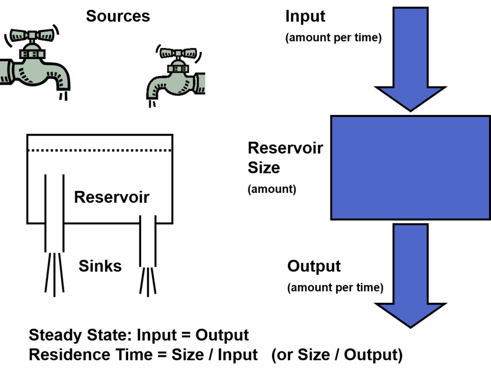 Steady state and residence times Steady state = sum of all sources = sum of all sinks so there fore the reservoir stays constant aswell - allowing reidence times to be calculate, thses are useful for looking at the time-scale of turnover in reservioirs.