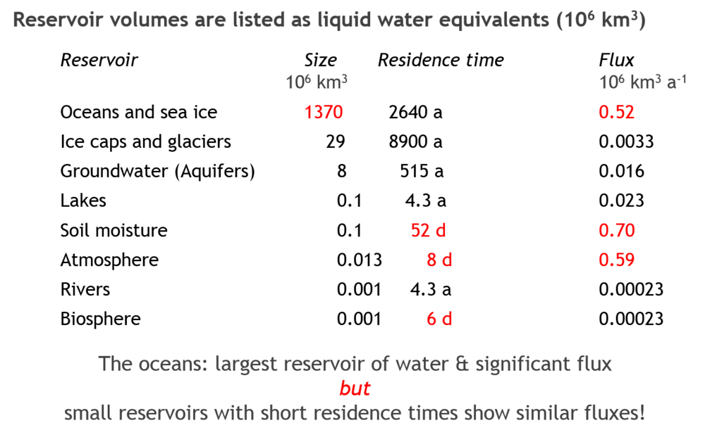 Reservoirs of available water Oceans and sea ice - 1370Ice caps and galciers - 29 groundwater - 8 lakes - 0.1soil moisture - 0.1atmosphere - 0.013riivers - 0.001biosphere - 0.001 water reserviors on the continents are negligible in terms of volume small reserviors are importan becuase ofthier role in the water cycle
