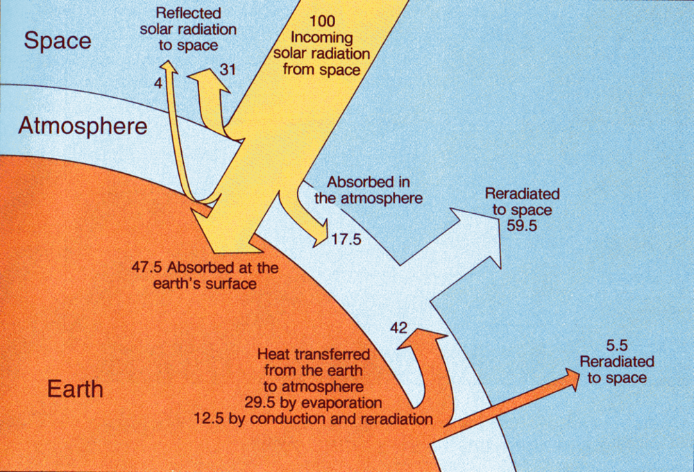 Outgoing radiaition required return of absorbed radiaition -radiation emitted from earths surface to space = 5.5%-radiaition emitted back to the atmosphere back to space = 59.5%heat transported from earths surface to atmosphere = 42% -evaporation = 29.5%-conduction and re-emission = 12.5%